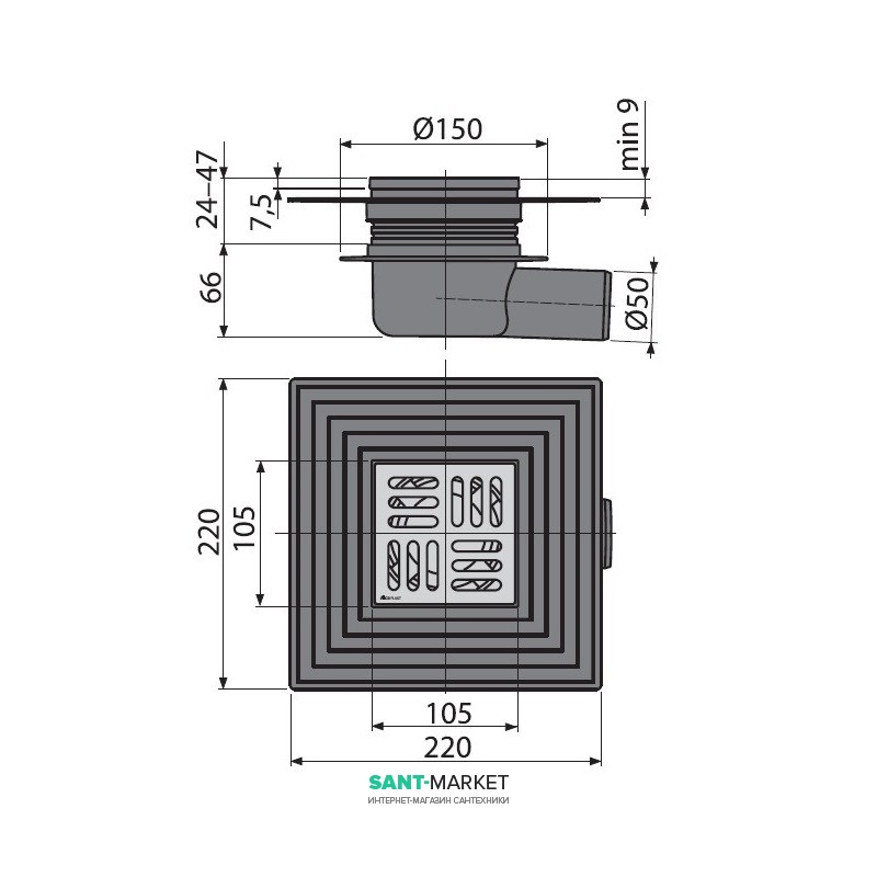 Трап для балконів і терас AlcaPlast сухий гізрозатвор бічній випуск 105х105 APV26C