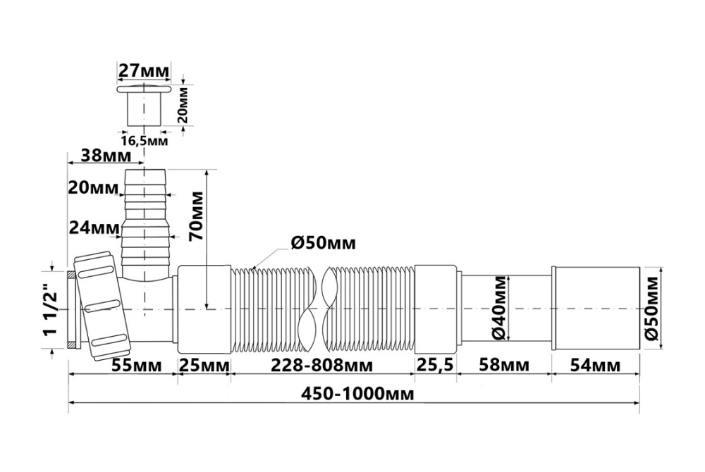 Труба розтяжна McAlpine 1 м 1½х40/50 мм з підключенням до пральної машини поліпропілен білий MRMF2W