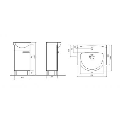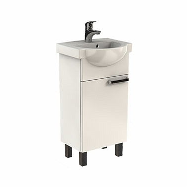 Складається з: меблевої раковини 45 x 40 см + тумби 40,5 x 67,1 x 28,6 см. Колір: білий глянець. Можливість встановлення дверей з відкриванням ліворуч або праворуч. У комплекті: монтажний комплект, інструкція зі збирання, ручка, ніжки (колір - хром глянець).