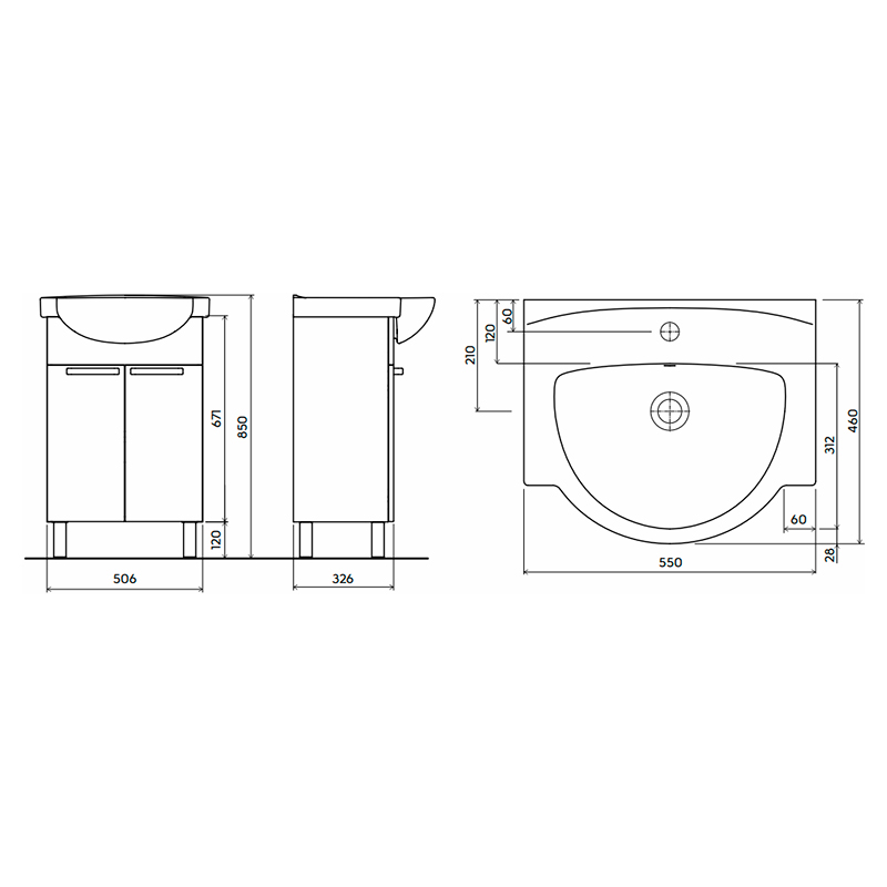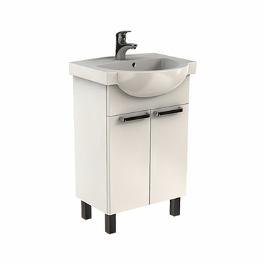 Складається з: меблевої раковини 55 x 46 см + тумби 50,6 x 67,1 x 32,6 см. Колір: білий глянець. У комплекті: монтажний комплект, інструкція зі збирання, ручки, ніжки (колір - хром глянець).