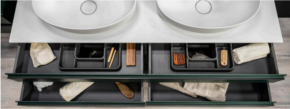 - Яскраві, що безшумно закриваються. Спеціальні системи демпфування дозволяють повільно і водночас тихо закривати ящики, забезпечуючи функціональний комфорт у ванній кімнаті.
