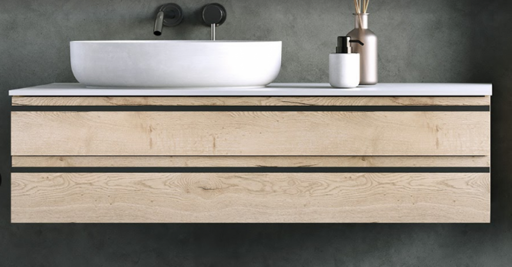 Меблі для ванної кімнати Alexis. Alexis OA в різних розмірах є підвісною тумбою і стільницею зі штучного каменю Керрок. М'яке закривання ящика для максимальної зручності. Раковини купуються окремо.