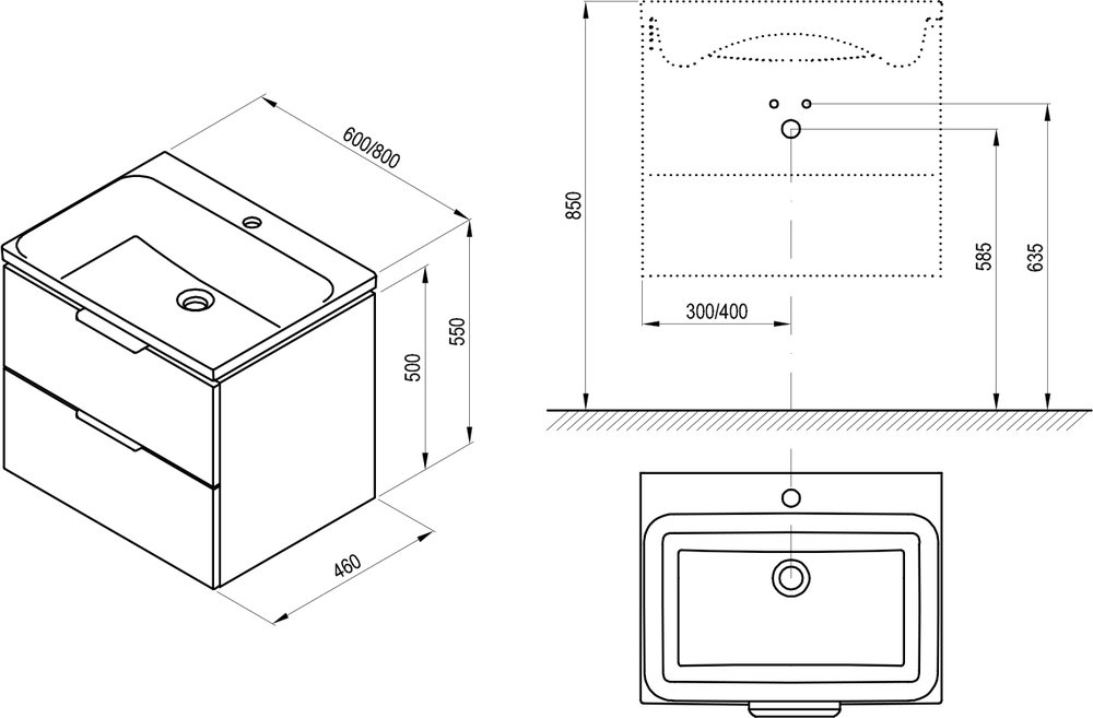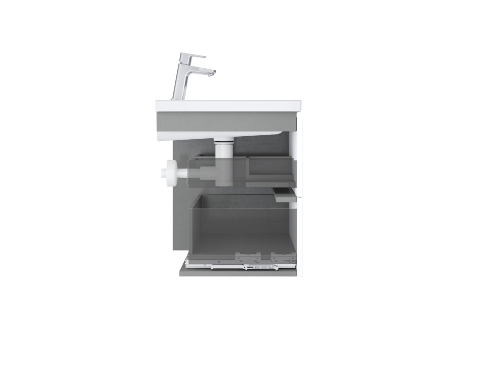 Просторий шафа оснащений двома повільними коробками. Шафа має попередньо оброблені отвори для ручок, які не включаються, їх потрібно придбати окремо в кількості 2 штук. Існує три варіанти для кольорів - глянсовий хром, чорний або білий. Підвісну шафу можна поєднуватиЗ побудованим керамічним комфортом Washbasin 600/800 та сифон для умивальника з нерухомим стоком. Ще одне рішення - це комбінація стільниці комфорту 600/800 та умивальниць на стільниці.