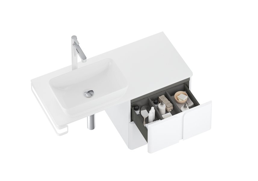 Підвісну тумбу можна комбінувати з вмивальником Balance 500, що вбудовується.доповнений сифоном та фіксованим зливом. Іншим рішенням є комбінація зі стільницею Balance 1200, доповненою держателем для рушників, на яку ви встановите умивальник для стільниці. На додаток до місця зберігання в тумбі, ви також отримаєте щедре місце для зберігання на стільниці.