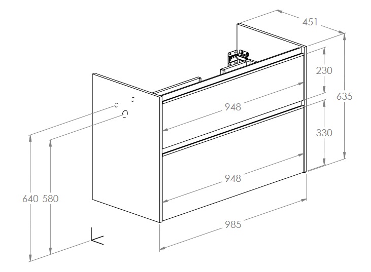 верхній ящик з вирізом під сифон, тумба без ручок (ручки можна купити окремо)