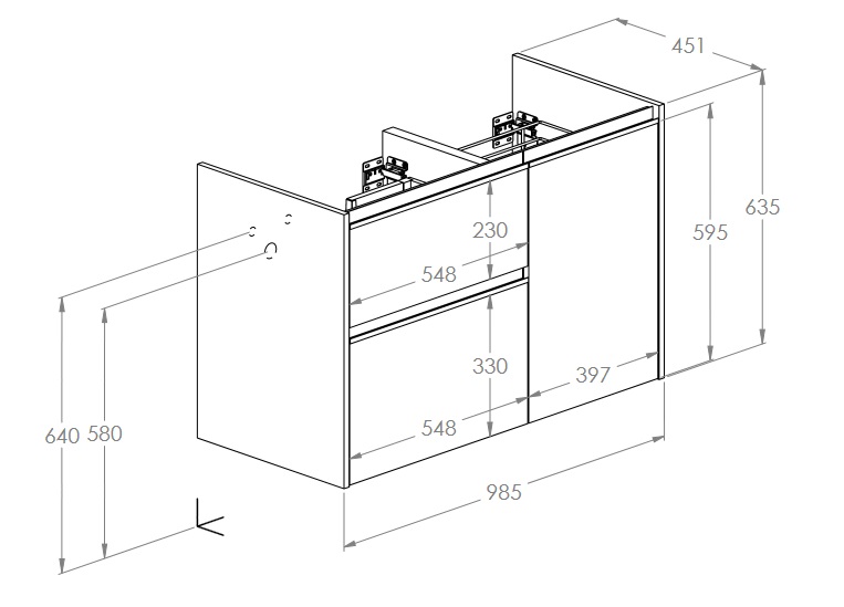 верхній ящик з вирізом під сифон, тумба без ручок (ручки можна купити окремо)