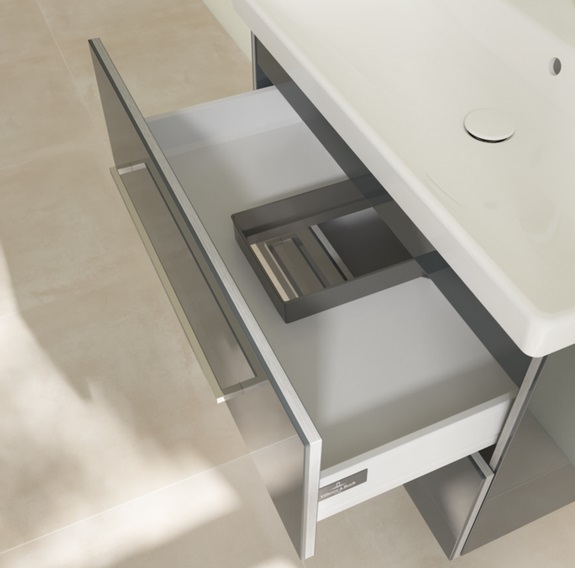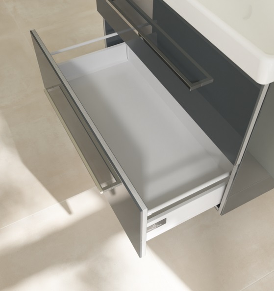 Завдяки сучасній технології SoftClosing навіть різке закривання висувних ящиків і дверей відбувається безшумно і плавно. Механізм SoftClosingгальмує висувний ящик і за допомогою автоматичного повернення повільно і безшумно його засуває — це щадить не тільки наш слух, але й меблі для ванної.