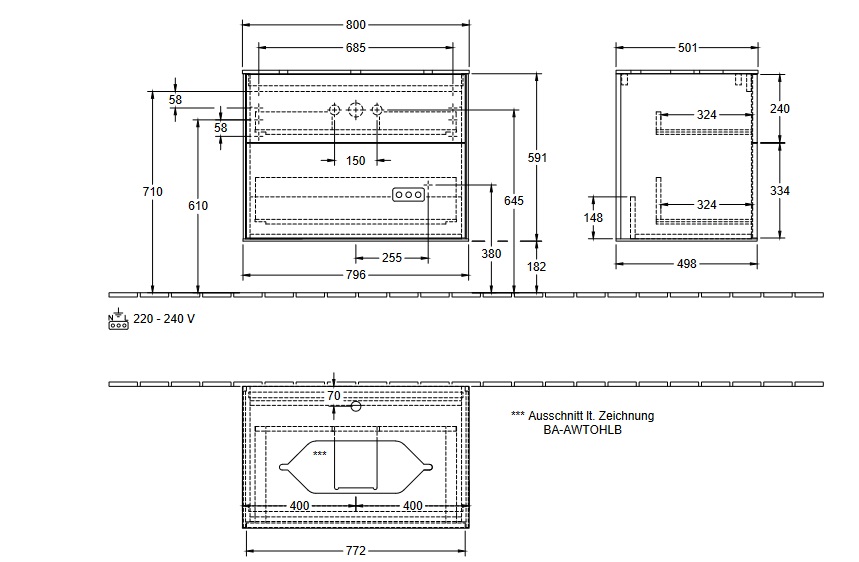 з підсвічуванням, ящики з функцією SoftClosing, з функцією Push-to-open, без отворів під змішувач