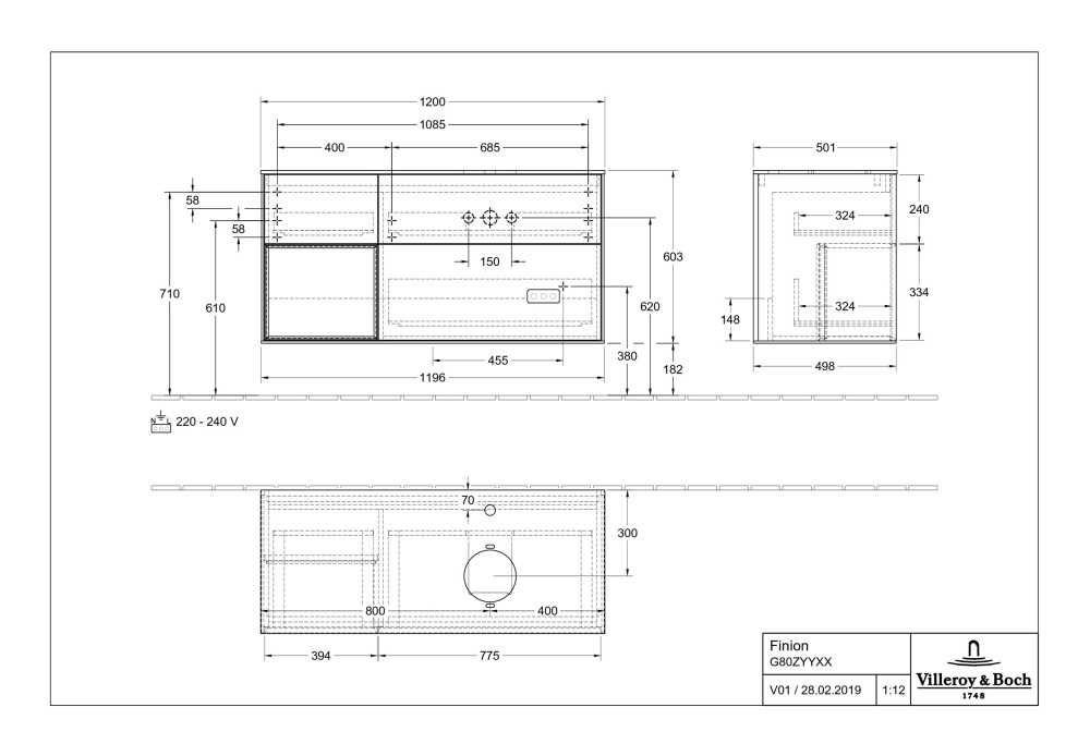 Тумба під раковину Villeroy & Boch Finion 120х50,1 см із підсвічуванням МДФ шпон волоського горіха/скло чорне матове G802GNGN