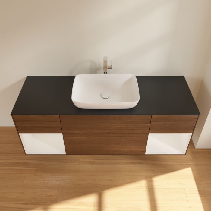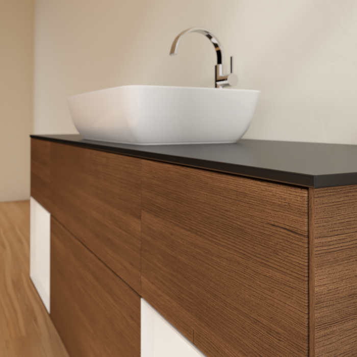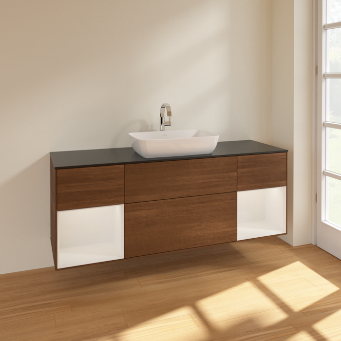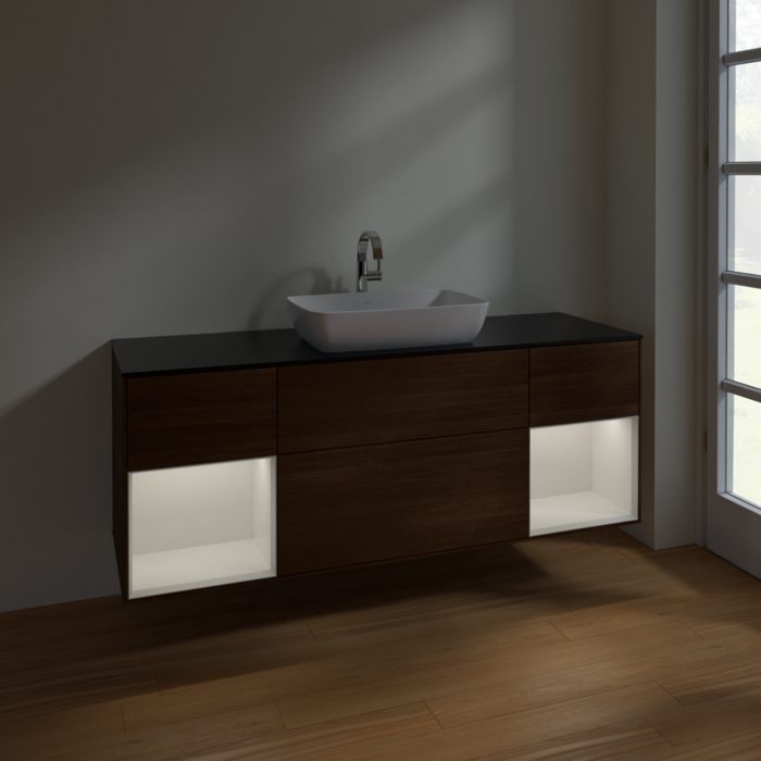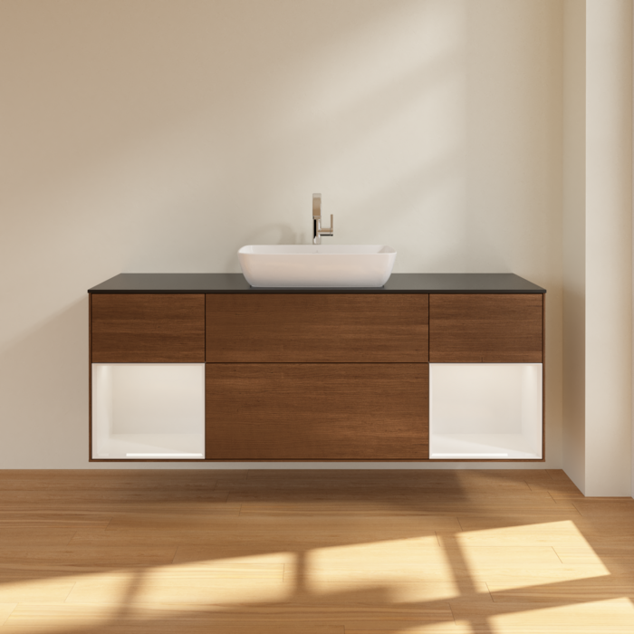 Тумба під раковину Villeroy & Boch Finion 160х50,1 см із підсвічуванням МДФ шпон волоського горіха/скло чорне матове F862GFGN
