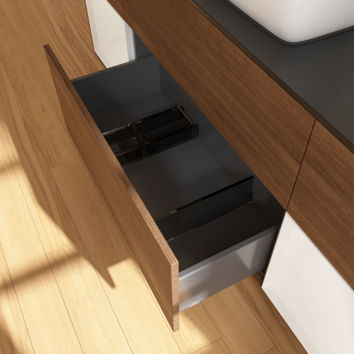 4 ящики (1 перегородка з високим склом, 3 перегородки з низьким рівнем скла, 1 контейнер для аксесуарівS, 1 контейнер для аксесуарів M, 2 Затягувані відділи з килимком проти Slip)