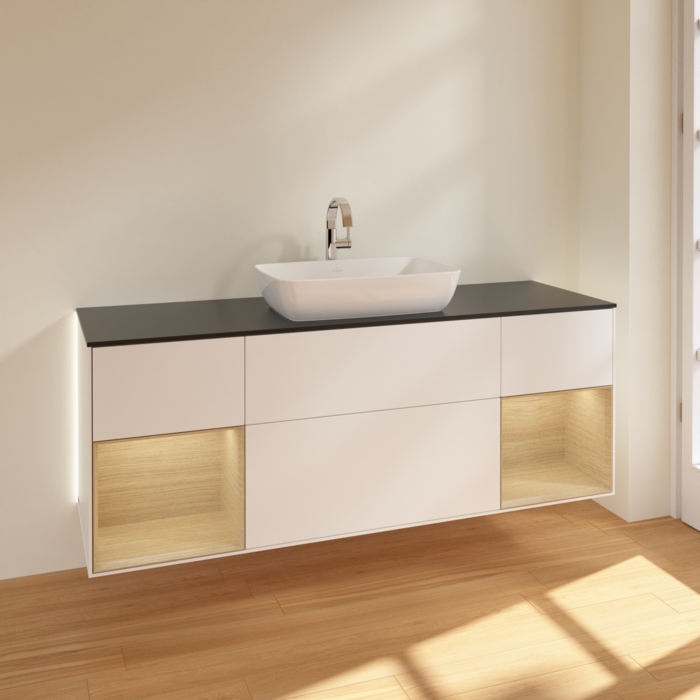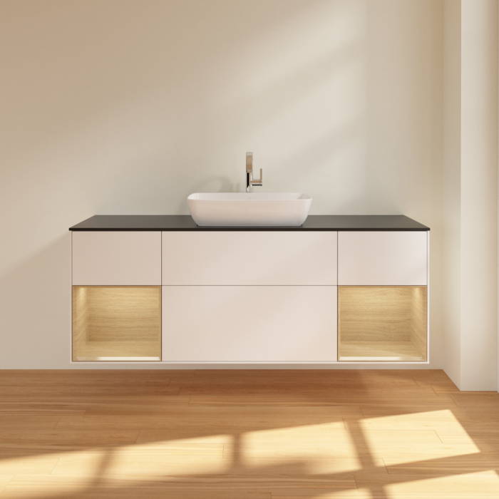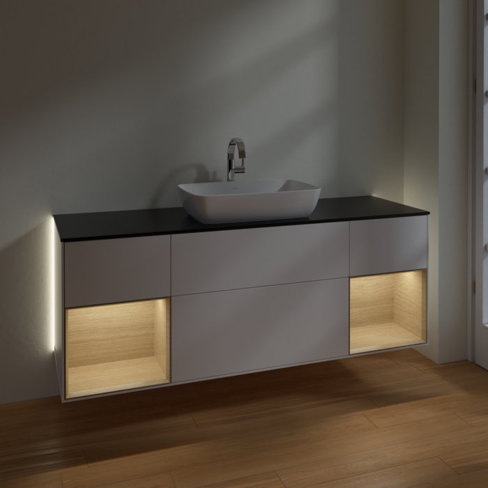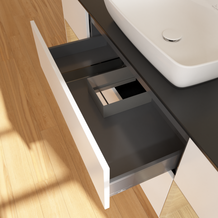 push-to-opeen Technology для максимальної зручності . технологіяПуск до відкриття у меблях для ванної кімнати Villeroy & Boch робить ваше повсякденне життя неймовірно легким. Фасади без ручок виглядають особливо елегантно, і завдяки технології, що відштовхується, їх можна легко відкрити та закрити з мінімальним тиском.