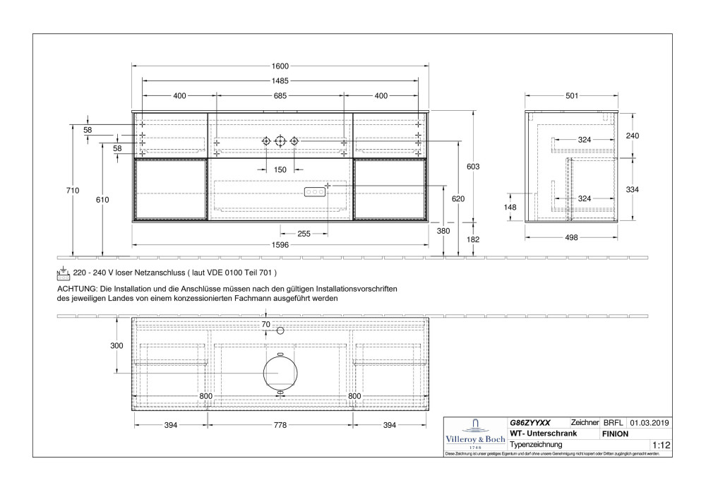 Тумба під раковину Villeroy & Boch Finion 160х50,1 см із підсвічуванням МДФ білий матовий лак/скло чорне матове G862PCMT