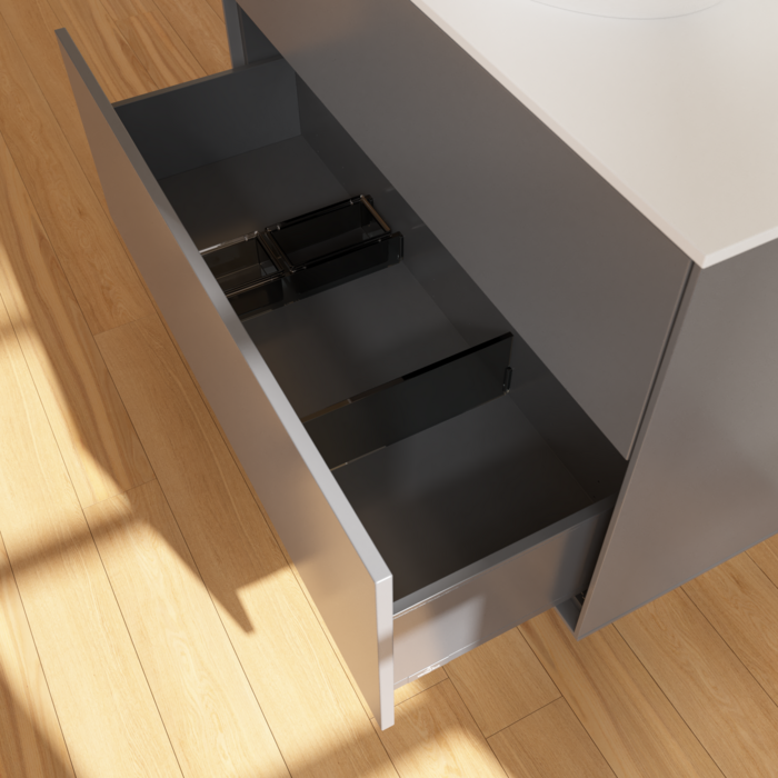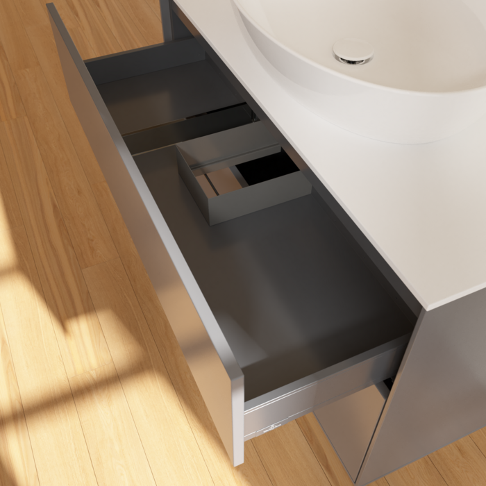 практичні внутрішні розділи. подумавВнутрішні перегородки у меблях для ванної кімнати Villary & Boch дозволяють індивідуально обслуговувати порядок у ванній кімнаті. Різні елементи, такі як регульовані скляні розділи та коробки для аксесуарів різного розміру, надають порядок та хороший огляд. Завдяки практичним внутрішнім розділам ви можете знайти часто використовувані аксесуари для ванної кімнати на перший погляд.