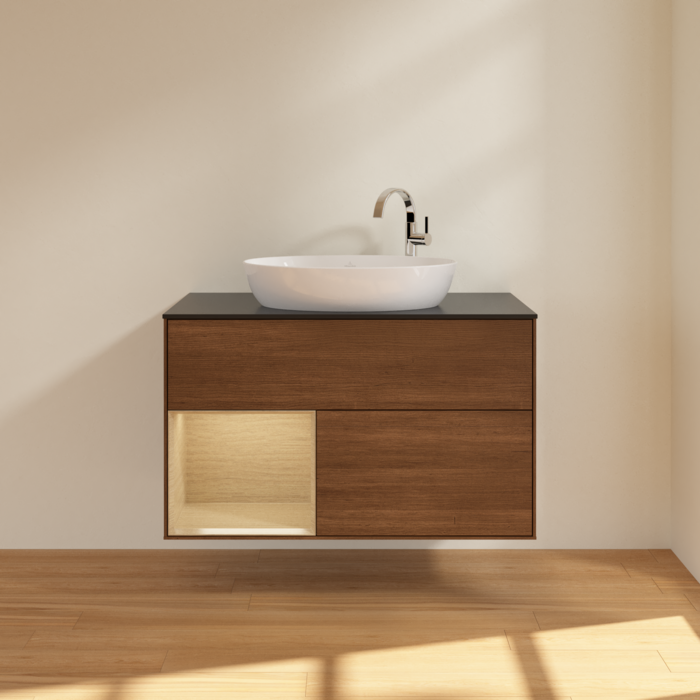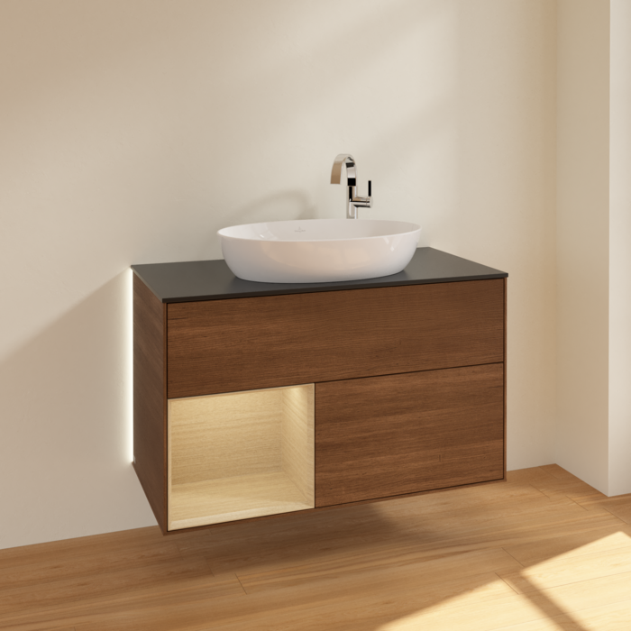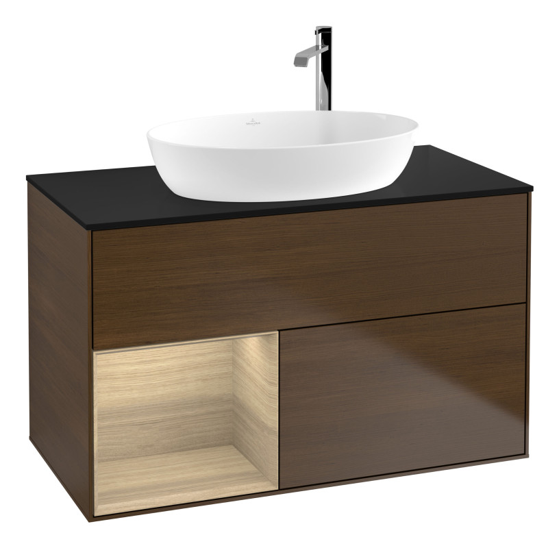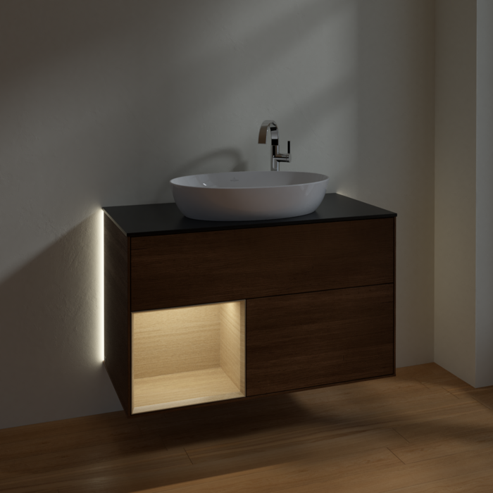Тумба під раковину Villeroy & Boch Finion 100х50,1 см із підсвічуванням МДФ шпон волоського горіха/скло чорне матове G892PCGN