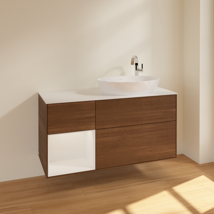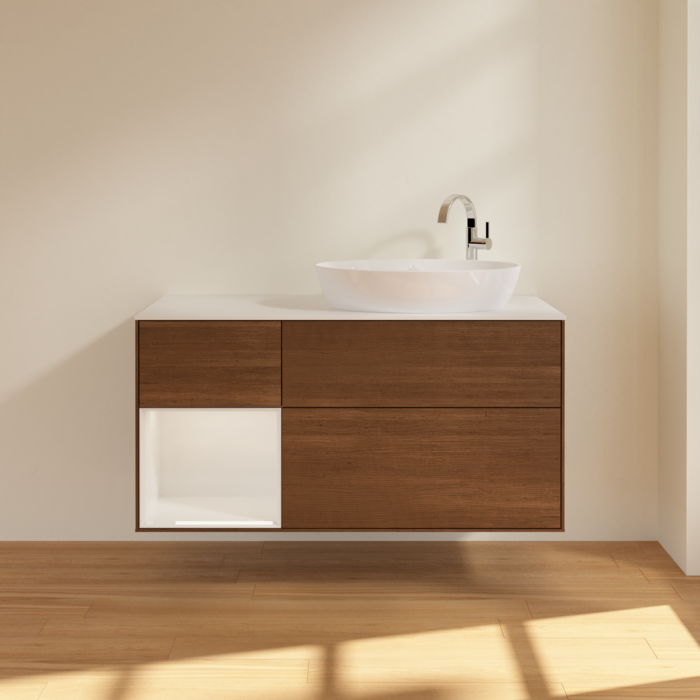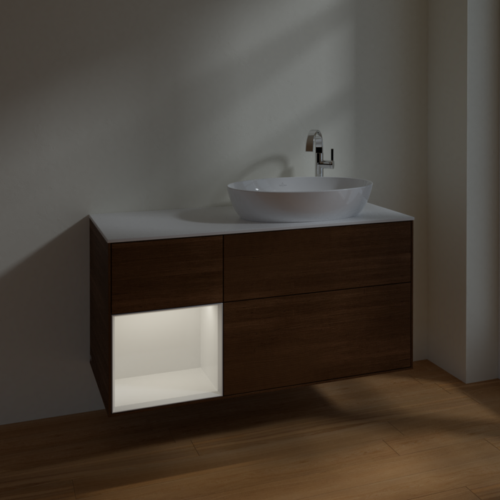 Тумба під раковину Villeroy & Boch Finion 120х50,1 см із підсвічуванням МДФ шпон волоського горіха/скло біле матове F921GFGN
