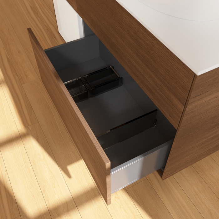 практичні внутрішні розділи. продумані внутрішні перегородки у ванній кімнаті Villeroid дозволяють індивідуально підтримувати замовлення у ванній кімнаті. Різні елементи, такі як регульовані скляні розділи та коробки для аксесуарів різного розміру, надають порядок та хороший огляд.Завдяки практичним внутрішнім розділам ви можете знайти часто використовувані аксесуари для ванної кімнати на перший погляд.