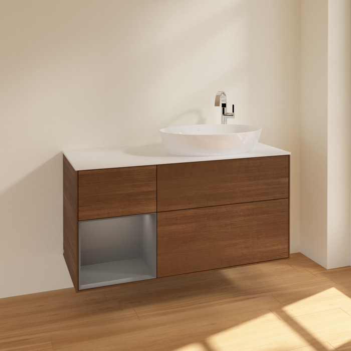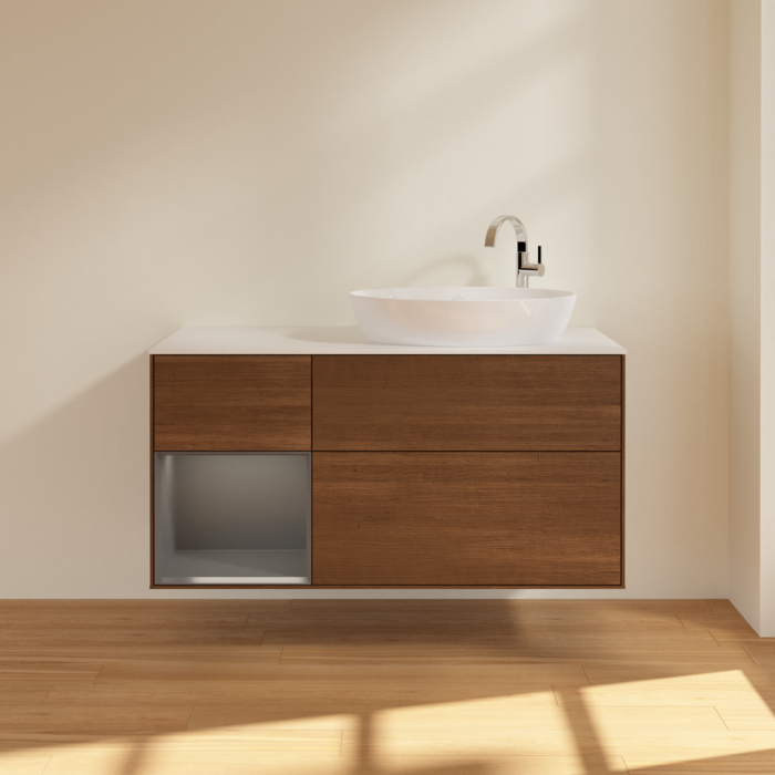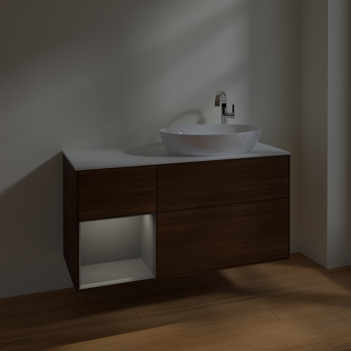 Тумба під раковину Villeroy & Boch Finion 120х50,1 см із підсвічуванням МДФ шпон волоського горіха/скло біле матове F921GKGN