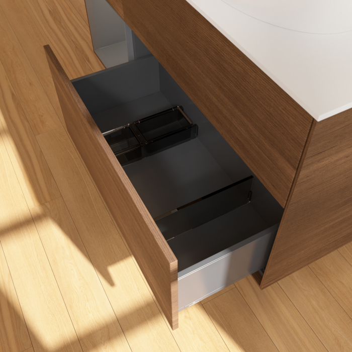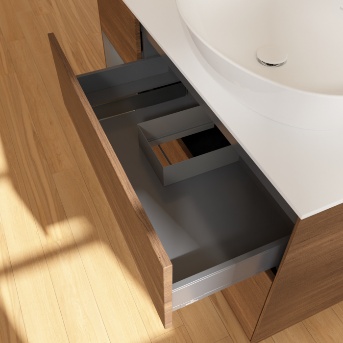 двері та коробки за допомогою механізму програмного розчину та пристрою саморегуляції. Сучасна технологія програмного розчину закриває коробки та двері плавно та обережно, навіть коли додаток потужності. Механізм м'якого розчинення уповільнює коробку коробки і автоматично закриває його, повільно і мовчки - він не тільки приємний для слуху, але й ретельно обробляє меблі для ванної кімнати.