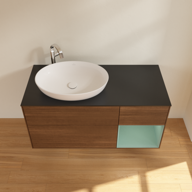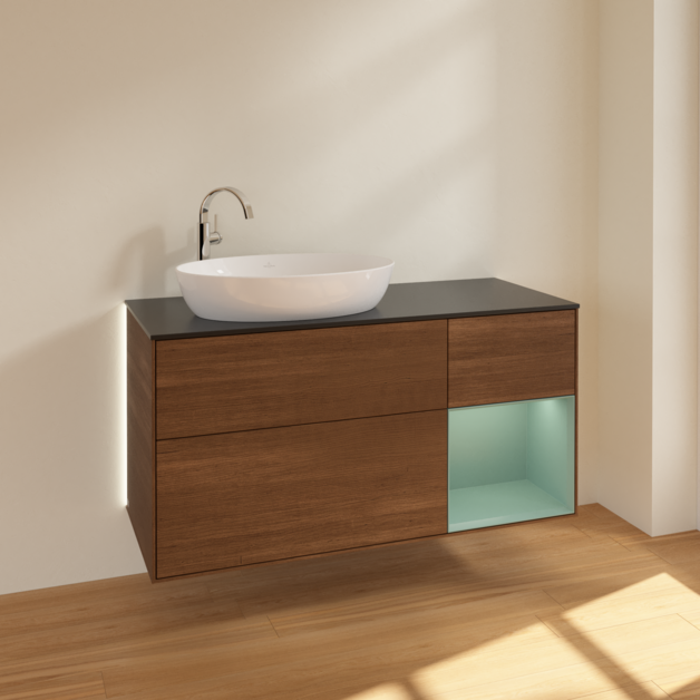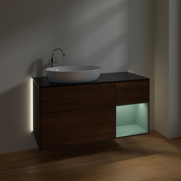 Тумба під раковину Villeroy & Boch Finion 120х50,1 см з підсвічуванням МДФ шпон волоського горіха/скло чорне матове G932GMGN