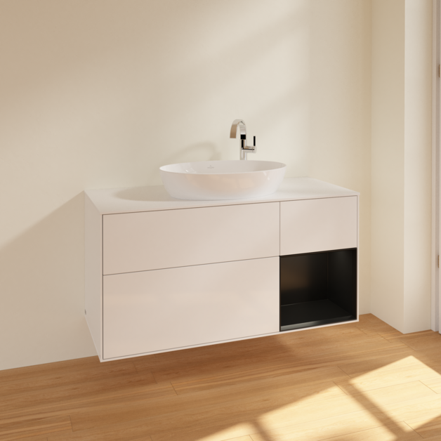 Експресивний дизайн та вишукане обладнання - Колекція меблів для ванних кімнат Villeroy & Boch Finion ідеально підходить.Об'єднана система освітлення меблів створює певну атмосферу у вашій ванній кімнаті, а модульні полиці та шафи різних кольорів забезпечують свою індивідуальність. Меблі для ванної кімнати з колекції Villeroid& Boch Finion зі стінами з товщиною лише 8 мм підкреслює лаконізм дизайну.