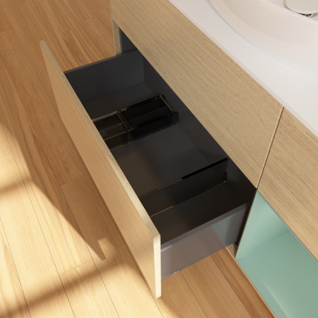 Добре -думка про внутрішнє розділення меблів для ванної кімнати Villeroy & Boch дозволяє створити індивідуальну систему організаціїПростори у ванній. Елементи, розташування яких можна змінити, наприклад, регульовані скляні розділи та контейнери для аксесуарів різного розміру, забезпечують хороший огляд та порядок. Завдяки практичній системіВнутрішнє розділення Ви швидко знайдете аксесуари для ванної кімнати, якими ви постійно користуєтесь.