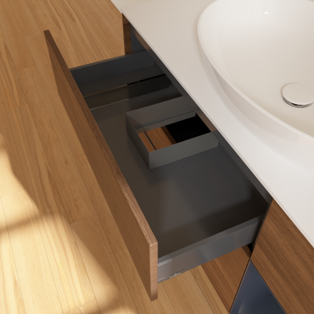 Свердловина -думка про внутрішнє розділення ванної кімнати Villeroy & Boch дозволяє створити індивідуальну систему організації місця у ванній кімнаті. Елементи, розташування яких можна змінити, наприклад, регульоване склоПерегородки та контейнери для аксесуарів різного розміру забезпечують хороший огляд та порядок. Завдяки практичній системі внутрішнього розділення, ви швидко знайдете аксесуари для ванної кімнати, які ви постійноВикористання.