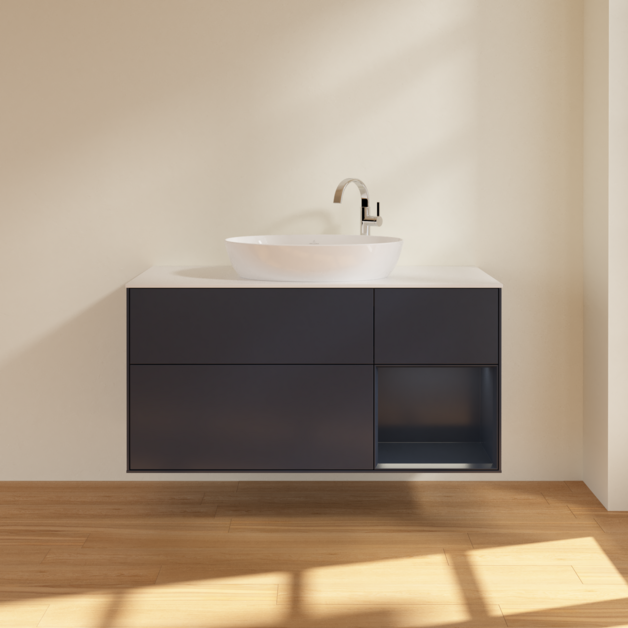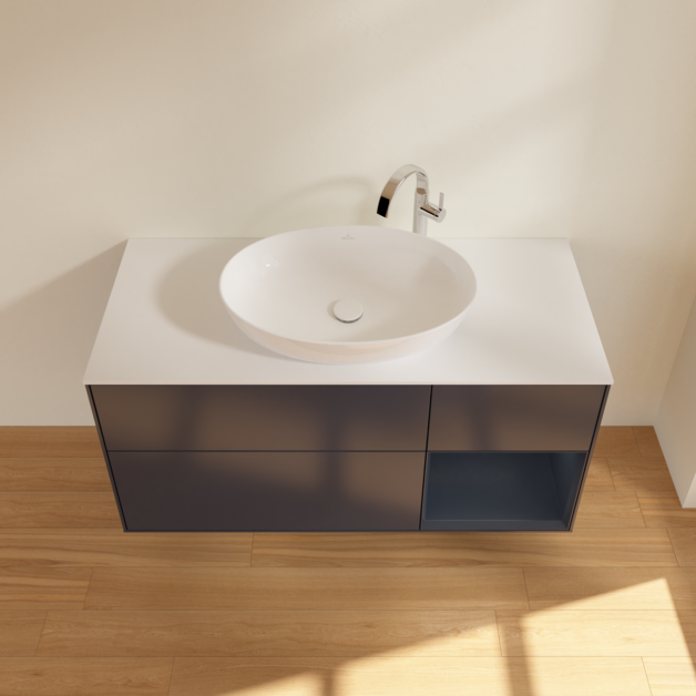 Експресивний дизайн та вишукане обладнання - Колекція меблів для ванних кімнат Villeroy & Boch Finion ідеально підходить. Створюється одна система підсвічування меблівПевна атмосфера у вашій ванній кімнаті, а також модульні полиці та шафи різних кольорів забезпечують його індивідуальність. Меблі для ванної кімнати з колекції Villeroy & Boch Finion з товстими стінамиЛише 8 мм підкреслює стислість дизайну.
