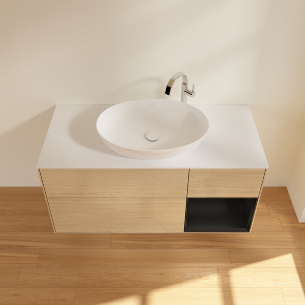 Експресивний дизайн та вишукане обладнання - Колекція меблів для ванних кімнат Villeroy & Boch Finion ідеально підходить. Створюється одна система підсвічування меблівПевна атмосфера у вашій ванній кімнаті, а також модульні полиці та шафи різних кольорів забезпечують його індивідуальність. Меблі для ванної кімнати з колекції Villeroy & Boch Finion з товстими стінамиЛише 8 мм підкреслює стислість дизайну.