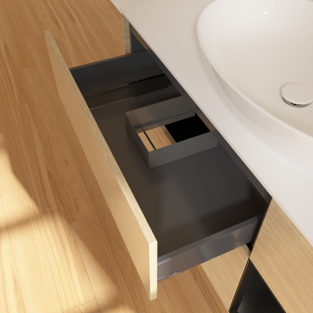 Свердловина -думка про внутрішнє розділення ванної кімнати Villeroy & Boch дозволяє створити індивідуальну систему організації місця у ванній кімнаті. Елементи, розташування яких можна змінити, наприклад, регульоване склоПерегородки та контейнери для аксесуарів різного розміру забезпечують хороший огляд та порядок. Завдяки практичній системі внутрішнього розділення, ви швидко знайдете аксесуари для ванної кімнати, які ви постійноВикористання.