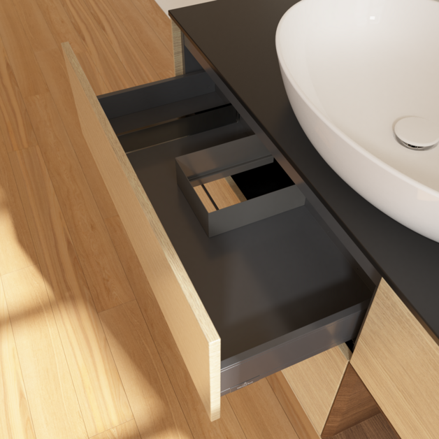 Свердловина -думка про внутрішнє розділення ванної кімнати Villeroy & Boch дозволяє створити індивідуальну систему організації місця у ванній кімнаті. Елементи, розташування яких можна змінити, наприклад, регульоване склоПерегородки та контейнери для аксесуарів різного розміру забезпечують хороший огляд та порядок. Завдяки практичній системі внутрішнього розділення, ви швидко знайдете аксесуари для ванної кімнати, які ви постійноВикористання.