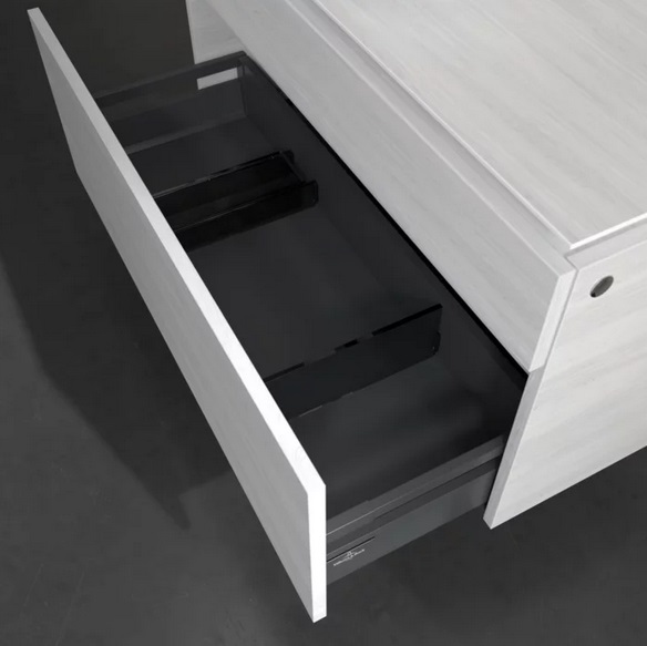 Продуманий внутрішній поділ меблів для ванної кімнати Villeroy & Boch дозволяє створити індивідуальну систему організації простору у ванній кімнаті. Елементи, розташування яких можна змінювати, наприклад, регульовані скляні перегородки та контейнери для аксесуарів різних розмірів,забезпечують хороший огляд та порядок. Завдяки практичній системі внутрішнього поділу ви швидко знаходитимете приладдя для ванної, якими ви постійно користуєтеся.