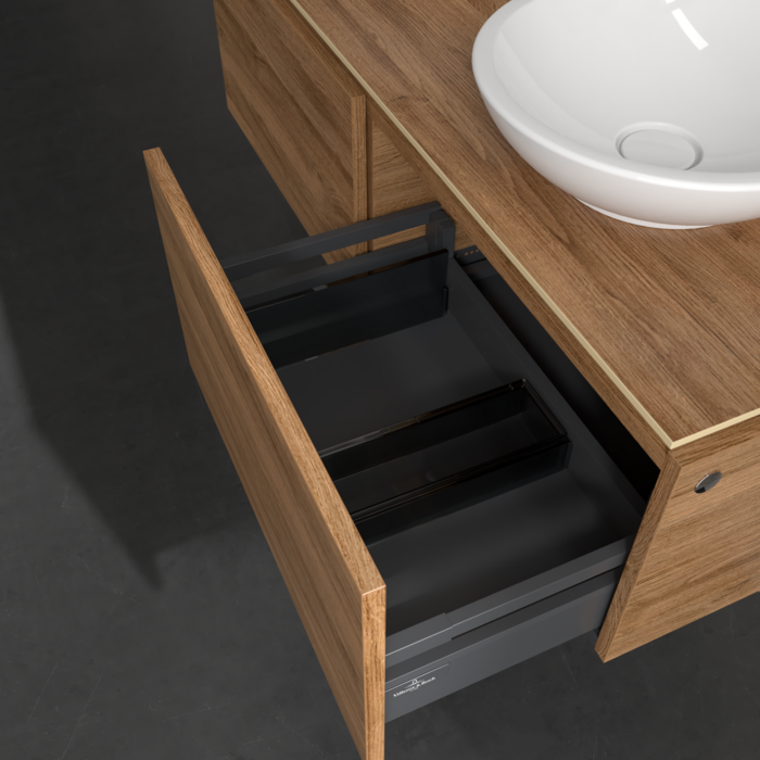 Практичні внутрішні перегородки. Продумані внутрішні перегородки в меблях для ванної кімнати Villeroy & Boch дозволяють індивідуально підтримувати порядок у ваннійкімнаті. Різні елементи, такі як регульовані скляні перегородки та ящики для різних розмірів аксесуарів, забезпечують порядок і хороший огляд.