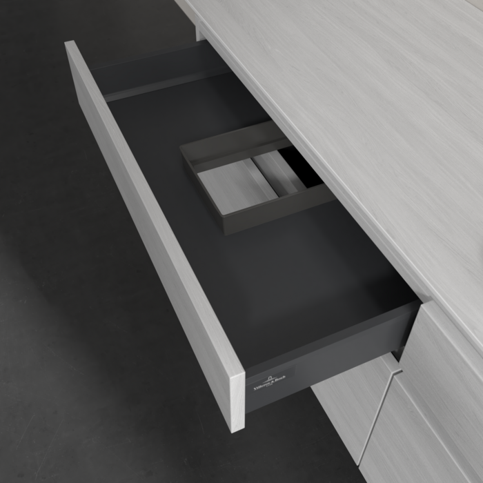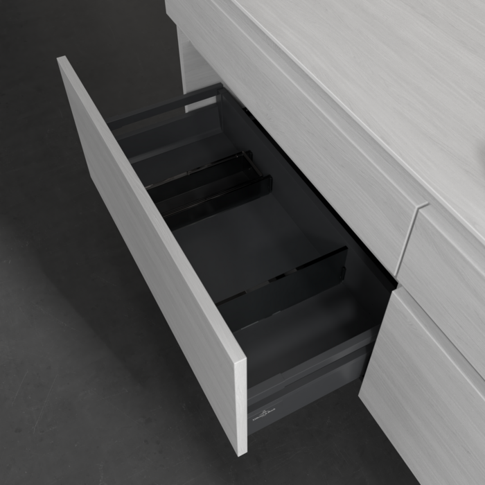 Практичні внутрішні перегородки. Продумані внутрішні перегородки в меблях для ванної кімнати Villeroy & Boch дозволяють індивідуально підтримувати порядок у ваннійкімнаті. Різні елементи, такі як регульовані скляні перегородки та ящики для різних розмірів аксесуарів, забезпечують порядок і хороший огляд.