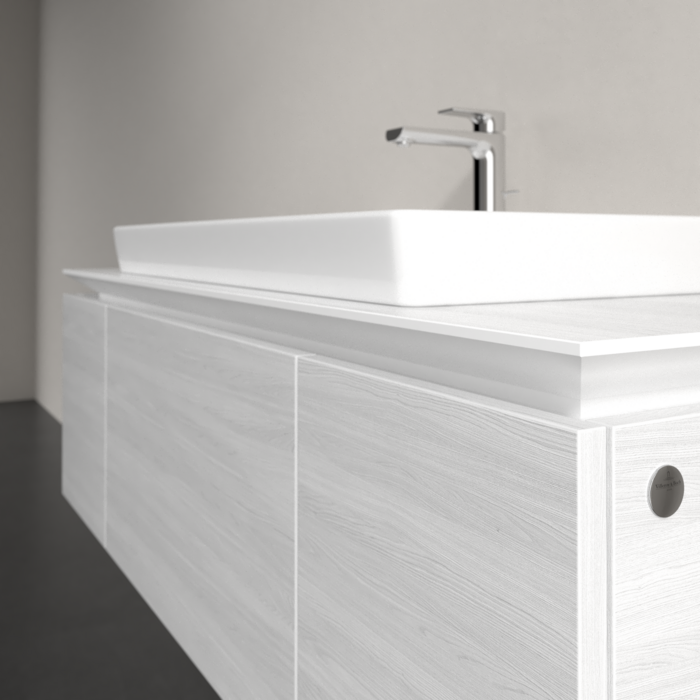 Legato — це комплексна колекція для ванних кімнат у лаконічному та елегантному стилі, яка відповідає найвимогливішим вимогам. Прямі лінії виробів із кераміки ідеально доповнюють виразний дизайн меблів цієї успішної колекції. Завдяки вишуканим деталям, таким як опціональне вбудоване світлодіодне освітлення з регульованою яскравістю та скошені краї, тумби під раковину для накладного монтажу здаються ширяючими.