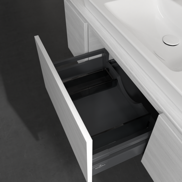 Практичні внутрішні перегородки. Продумані внутрішні перегородки у меблях для ванної кімнати Villeroy & Boch дозволяють індивідуально підтримуватипорядок у ванній кімнаті. Різні елементи, такі як регульовані скляні перегородки та ящики для різних розмірів аксесуарів, забезпечують порядок і хороший огляд.