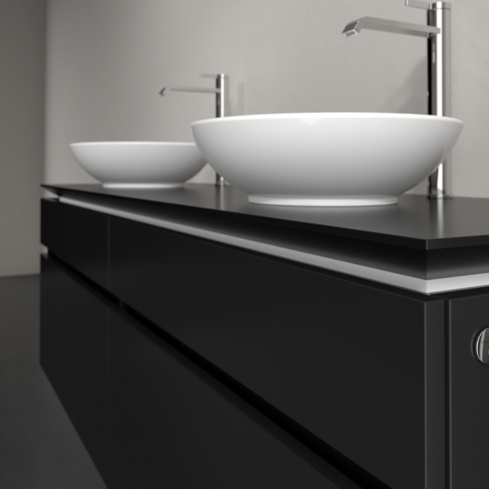 Legato — це комплексна колекція для ванних кімнат у лаконічному та елегантному стилі, яка відповідає найвимогливішим вимогам. Прямі лінії виробів із кераміки ідеально доповнюють виразний дизайн меблів цієї успішної колекції. Завдяки вишуканим деталям, таким як опціональне вбудоване світлодіодне освітлення з регульованою яскравістю та скошені краї, тумби під раковину для накладного монтажу здаються ширяючими.