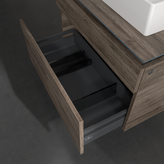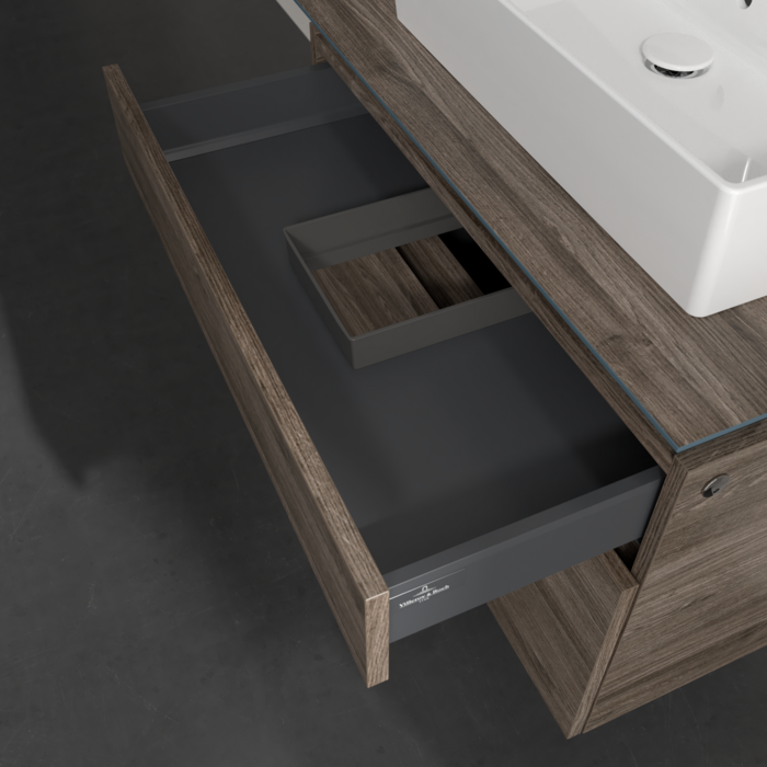Практичні внутрішні перегородки. Продумані внутрішні перегородки у меблях для ванної кімнати Villeroy & Boch дозволяють індивідуально підтримуватипорядок у ванній кімнаті. Різні елементи, такі як регульовані скляні перегородки та ящики для різних розмірів аксесуарів, забезпечують порядок і хороший огляд.