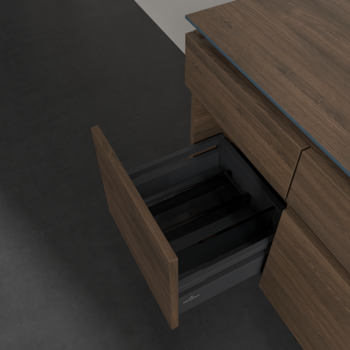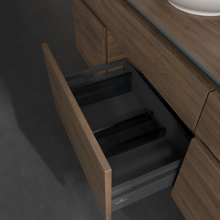 Практичні внутрішні перегородки. Продумані внутрішні перегородки у меблях для ванної кімнати Villeroy & Boch дозволяють індивідуально підтримуватипорядок у ванній кімнаті. Різні елементи, такі як регульовані скляні перегородки та ящики для різних розмірів аксесуарів, забезпечують порядок і хороший огляд.