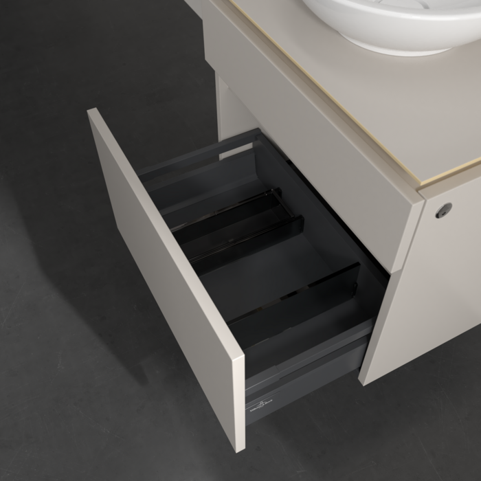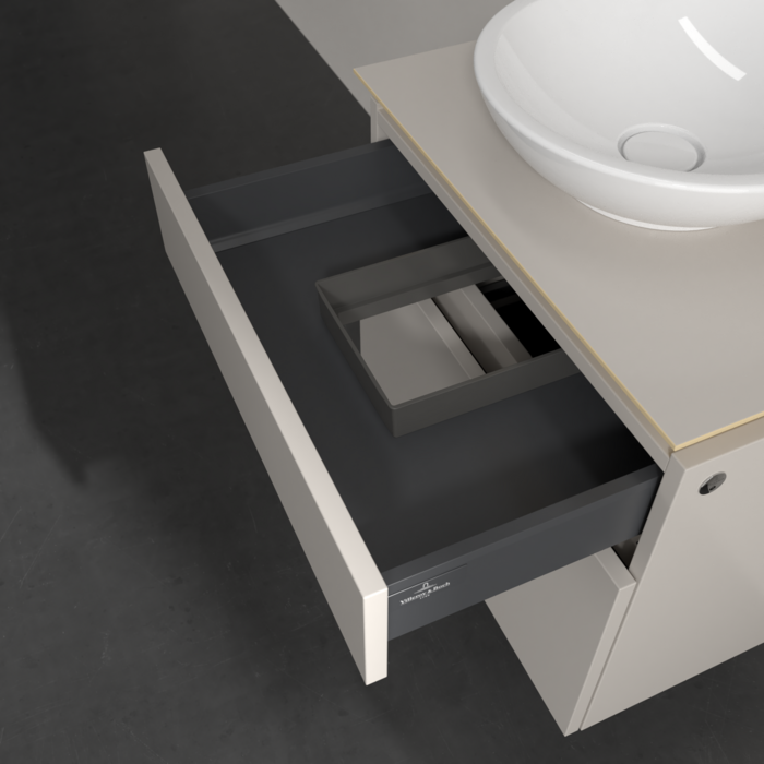 Практичні внутрішні перегородки. Продумані внутрішні перегородки у меблях для ванної кімнати Villeroy & Boch дозволяють індивідуально підтримуватипорядок у ванній кімнаті. Різні елементи, такі як регульовані скляні перегородки та ящики для різних розмірів аксесуарів, забезпечують порядок і хороший огляд.