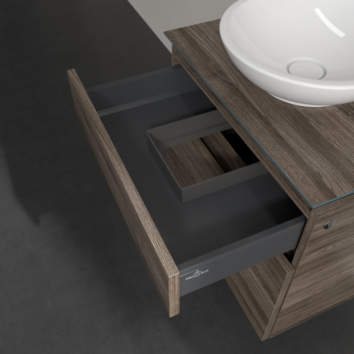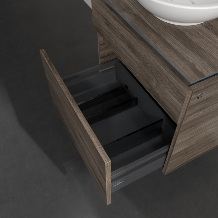 Практичні внутрішні перегородки. Продумані внутрішні перегородки у меблях для ванної кімнати Villeroy & Boch дозволяють індивідуально підтримуватипорядок у ванній кімнаті. Різні елементи, такі як регульовані скляні перегородки та ящики для різних розмірів аксесуарів, забезпечують порядок і хороший огляд.