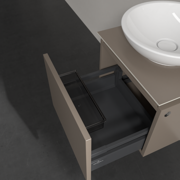 Практичні внутрішні перегородки. Продумані внутрішні перегородки у меблях для ванної кімнати Villeroy & Boch дозволяють індивідуально підтримуватипорядок у ванній кімнаті. Різні елементи, такі як регульовані скляні перегородки та ящики для різних розмірів аксесуарів, забезпечують порядок і хороший огляд.