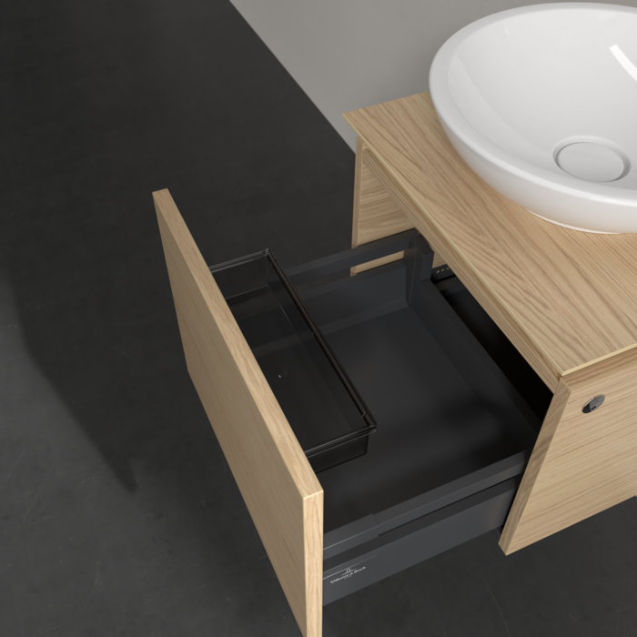 Практичні внутрішні перегородки. Продумані внутрішні перегородки у меблях для ванної кімнати Villeroy & Boch дозволяють індивідуально підтримуватипорядок у ванній кімнаті. Різні елементи, такі як регульовані скляні перегородки та ящики для різних розмірів аксесуарів, забезпечують порядок і хороший огляд.
