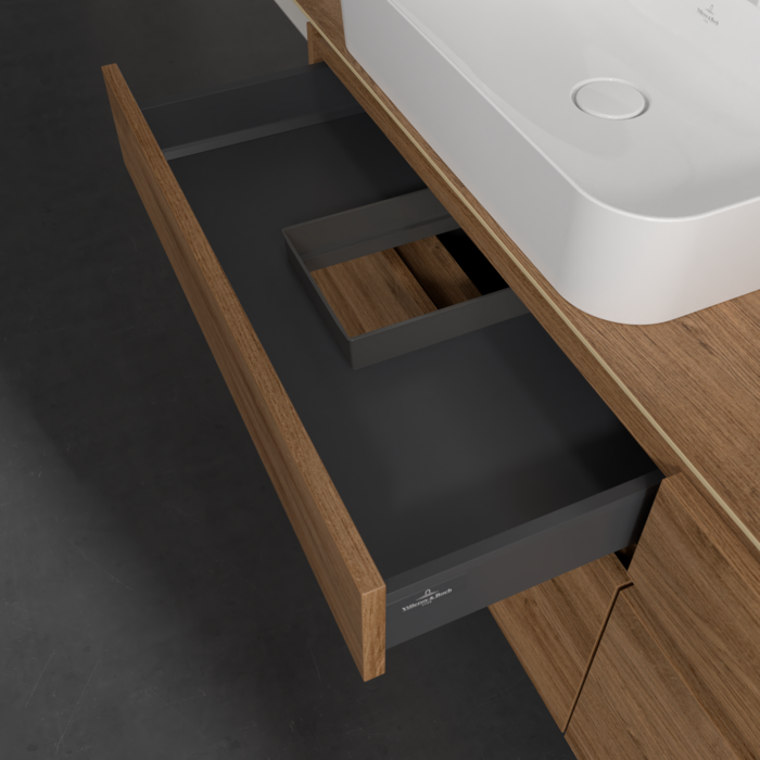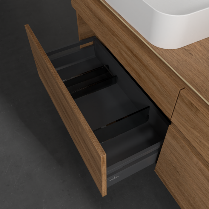 Практичні внутрішні перегородки. Продумані внутрішні перегородки в меблях для ванної кімнати Villeroy & Boch дозволяють індивідуально підтримувати порядок у ваннійкімнаті. Різні елементи, такі як регульовані скляні перегородки та ящики для різних розмірів аксесуарів, забезпечують порядок і хороший огляд.