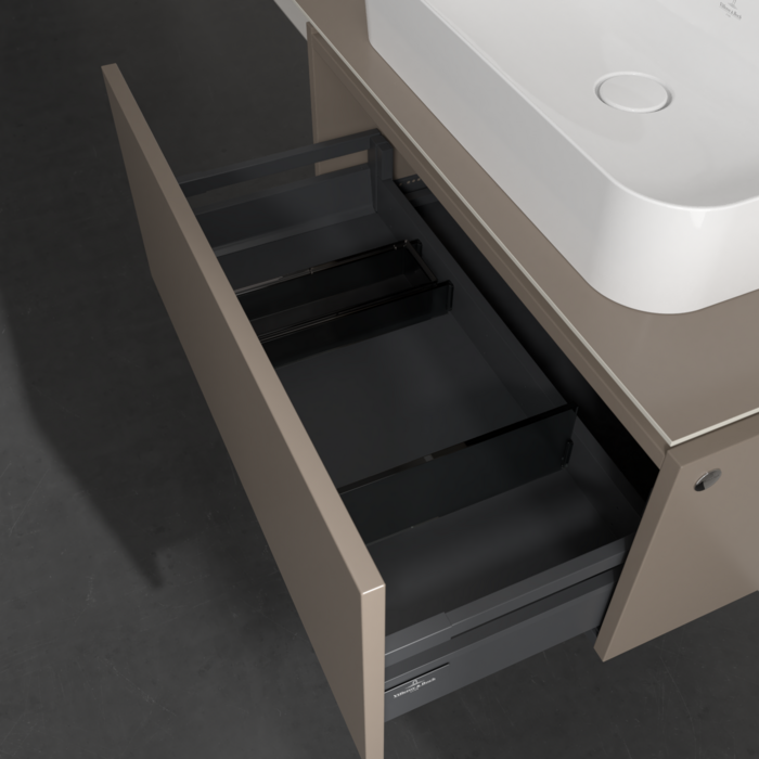Практичні внутрішні перегородки. Продумані внутрішні перегородки в меблях для ванної кімнати Villeroy & Boch дозволяють індивідуально підтримувати порядок у ваннійкімнаті. Різні елементи, такі як регульовані скляні перегородки та ящики для різних розмірів аксесуарів, забезпечують порядок і хороший огляд.