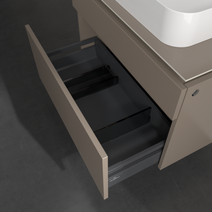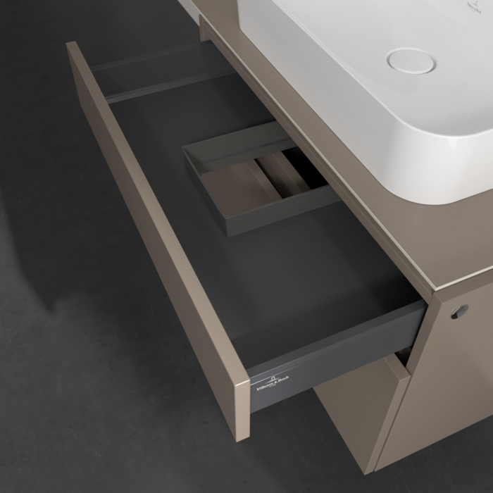 Практичні внутрішні перегородки. Продумані внутрішні перегородки в меблях для ванної кімнати Villeroy & Boch дозволяють індивідуально підтримувати порядок у ваннійкімнаті. Різні елементи, такі як регульовані скляні перегородки та ящики для різних розмірів аксесуарів, забезпечують порядок і хороший огляд.