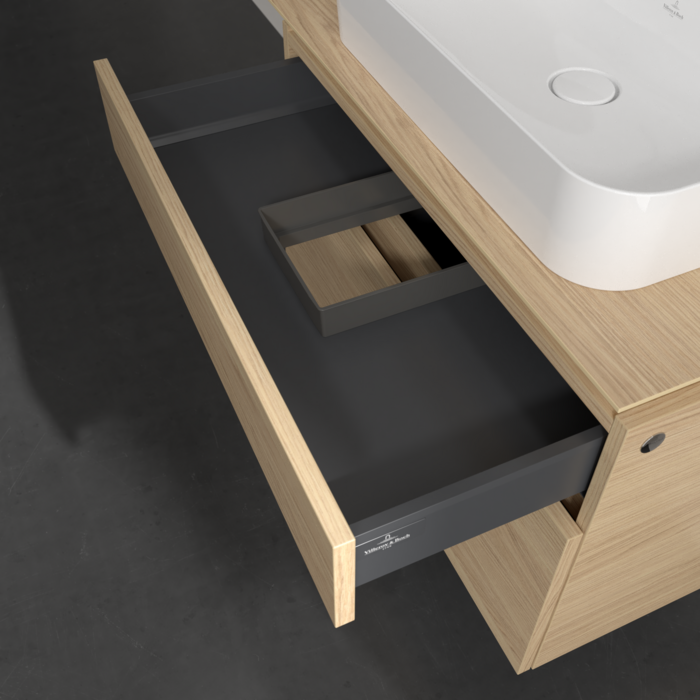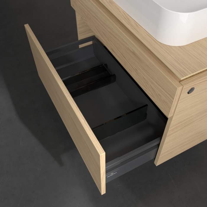 Практичні внутрішні перегородки. Продумані внутрішні перегородки в меблях для ванної кімнати Villeroy & Boch дозволяють індивідуально підтримувати порядок у ваннійкімнаті. Різні елементи, такі як регульовані скляні перегородки та ящики для різних розмірів аксесуарів, забезпечують порядок і хороший огляд.