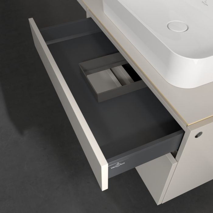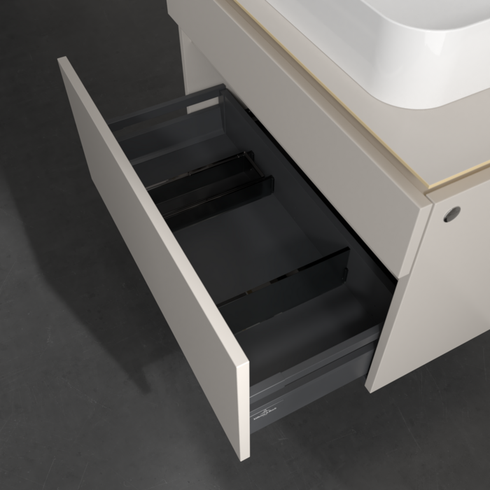 Практичні внутрішні перегородки. Продумані внутрішні перегородки в меблях для ванної кімнати Villeroy & Boch дозволяють індивідуально підтримувати порядок у ваннійкімнаті. Різні елементи, такі як регульовані скляні перегородки та ящики для різних розмірів аксесуарів, забезпечують порядок і хороший огляд.