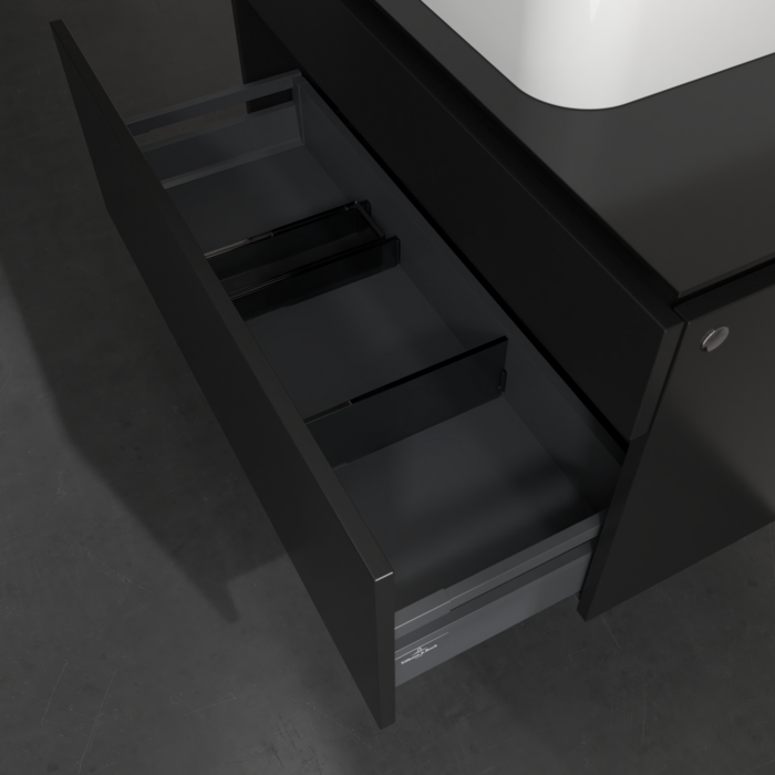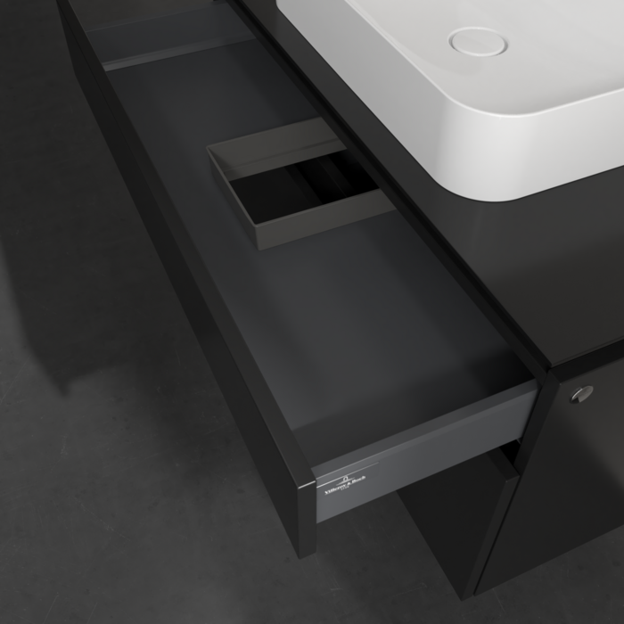 Практичні внутрішні перегородки. Продумані внутрішні перегородки у меблях для ванної кімнати Villeroy & Boch дозволяють індивідуально підтримуватипорядок у ванній кімнаті. Різні елементи, такі як регульовані скляні перегородки та ящики для різних розмірів аксесуарів, забезпечують порядок і хороший огляд.