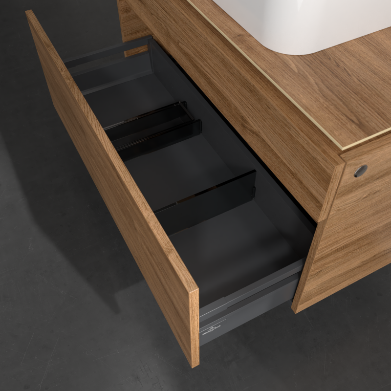 Практичні внутрішні перегородки. Продумані внутрішні перегородки в меблях для ванної кімнати Villeroy & Boch дозволяють індивідуально підтримувати порядок у ваннійкімнаті. Різні елементи, такі як регульовані скляні перегородки та ящики для різних розмірів аксесуарів, забезпечують порядок і хороший огляд.
